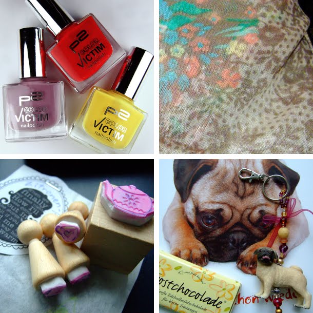 Afterwards I went shopping and bought three bottles of nail polish and a lovely scarf. At home I found two great swap packages with handmade stamps and a pug pendant. The day couldn’t be better. Apart from the weather :)!