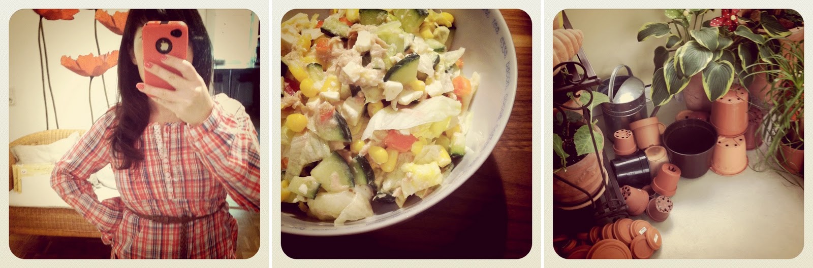 – 1. Checkered blouse. 2. Salad with tuna and feta cheese. 3. Cleaned my plant pots.
