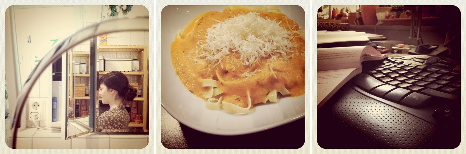 1. Gammeloutfit und Gammelhaare. 2. Nudeln mit Kürbissauce. 3. Gearbeitet. – 1. Lazy outfit and lazy hair = Lazy day. 2. Pasta with pumpkin sauce. 3. Worked.