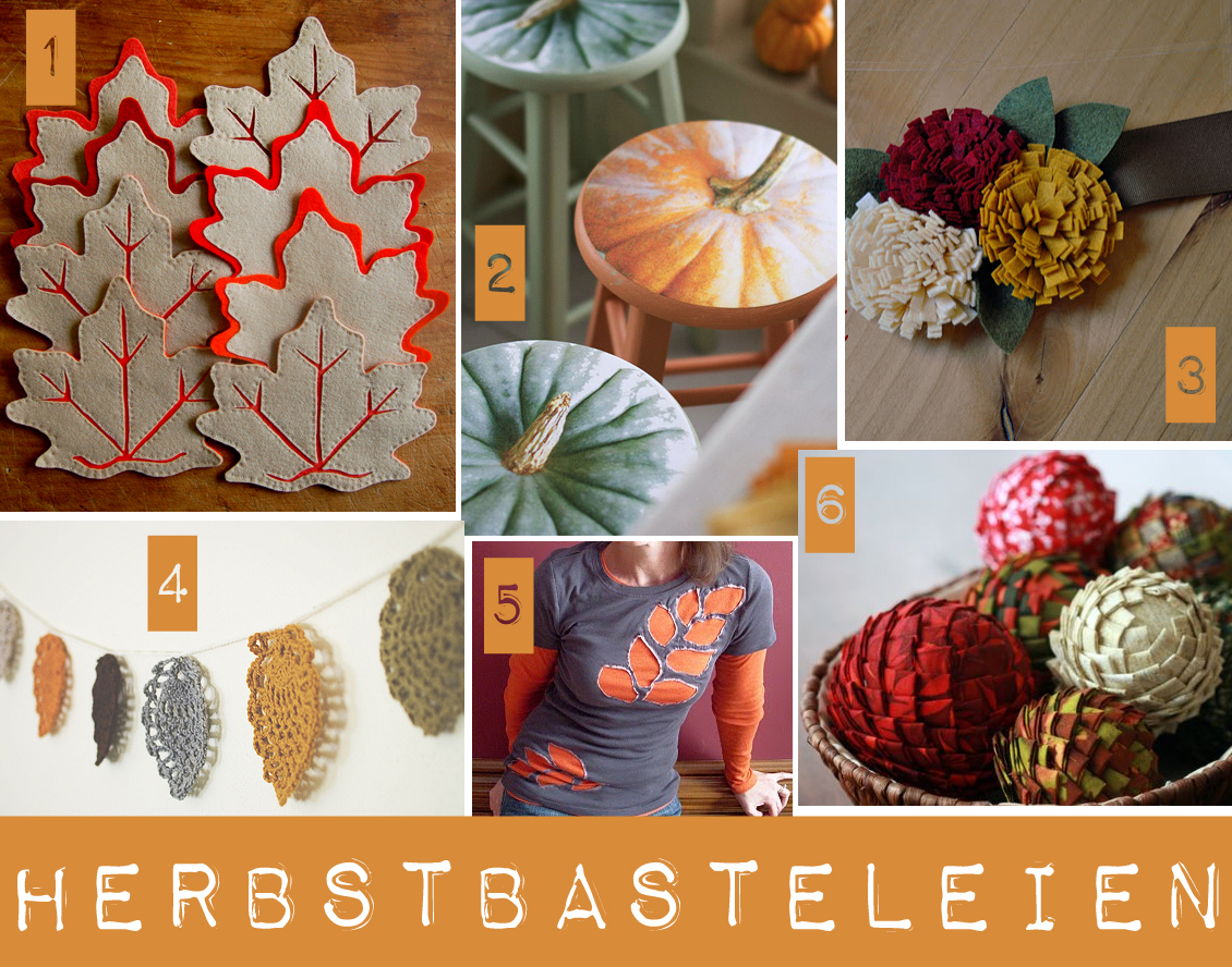 1. Blattuntersetzer. 2. Kürbistühle (die nötigen Kürbisnahaufnahmen hätte ich ja :)). 3. Herbstlicher Gürtel. 4. Häkelblätter-Girlande. Wie war das noch mal mit meinen angedachten Häkelplänen?! 5. Blätter-Shirt-Recycling. 6. Zapfen-Bälle.