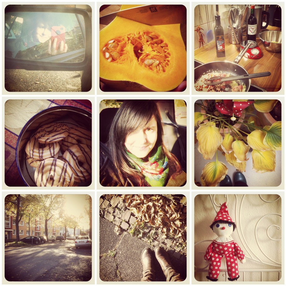 1. Seitenspiegellangeweilevertreibungsstrategie. 2. Der beste Kürbis der Welt, ach, was sag ich, des Universums: Butternut :). 3. Kochen. 4. Kaffeetrinken bei meiner Familie. 5. Beifahrerdasein. 6. Die Balkonpflanzen geben langsam den Geist auf. 7. Herbstliche Nachbarschaft. 8. Herbstfüße. 9. Wir hatten kleinen Besuch und deswegen die alte Spieluhr vom Freund ausgepackt. Und irgendwie ist sie geblieben :)!