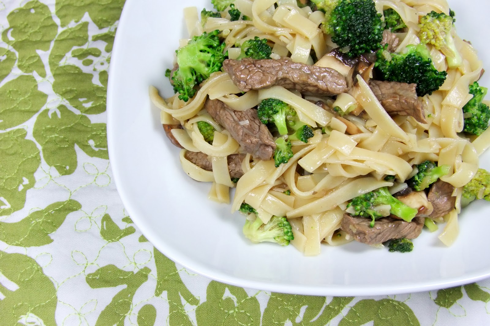 Für 2 Personen braucht ihr: 200g Rinderhüfte, 200g Brokkoli in kleinen Röschen, 150g Champignons, 1 Zwiebel, 2 Knoblauchzehen, ein walnussgroßes Stück Ingwer, Salz, Pfeffer, Zucker, Öl, etwas Sojasauce, etwas Stärke, Gemüsebrühe und Bandnudeln, wir nehmen 100g pro Nase. Knoblauch, Zwiebel und Ingwer fein hacken und in etwas Öl anbraten. Dann die Brokkoliröschen mit einer Prise Salz hinzugeben und einige Minuten mitbraten. In der Zwischenzeit das Fleisch in Streifen und die Pilze in Scheiben schneiden. Zunächst das Fleisch hinzugeben und kurz anbraten, dann die Pilze. Als nächstes eine Mischung aus 1-2 Esslöffeln Sojasauce, 150ml Gemüsebrühe, einer Prise Zucker und einem Löffel Stärke beigeben und alles noch wenige Minuten garen lassen. Die gekochten Nudeln zur Fleisch-Gemüse-Mischung in die Pfanne geben, unterrühren, alles ordentlich mit Salz und Pfeffer würzen und schmecken lassen!
