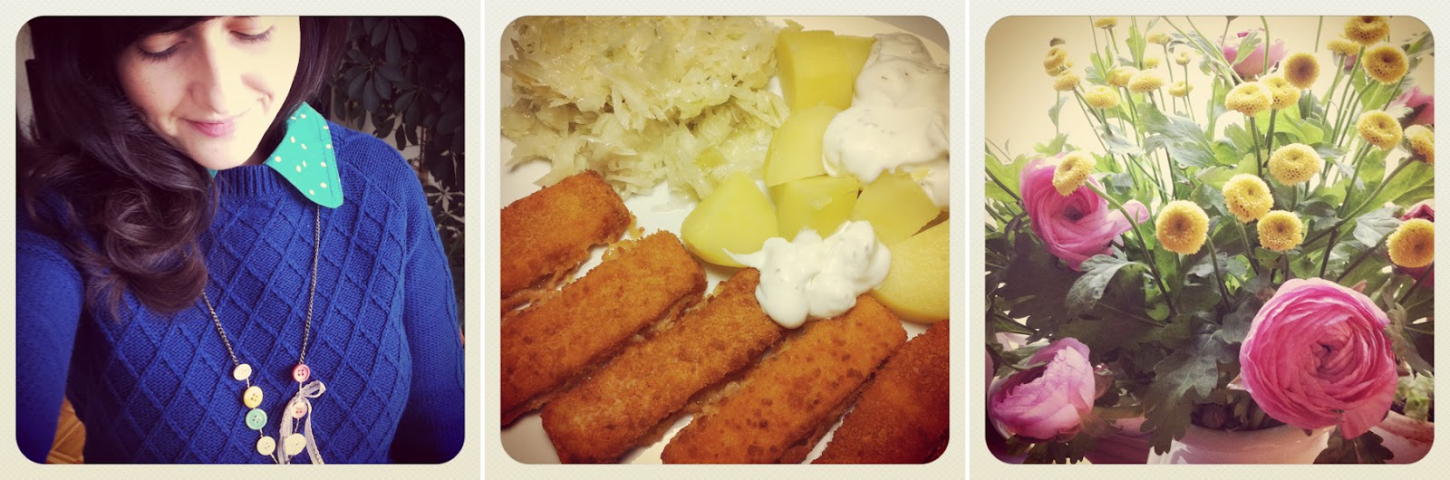 1. Neuen blauen Pulli. 2. Fischstäbchen, Kartoffeln (Doris, liest du das :)?!) mit Sour Cream und Krautsalat. 3. Mir den Frühling ins Haus geholt. Wenn er schon nicht von selbst kommt…