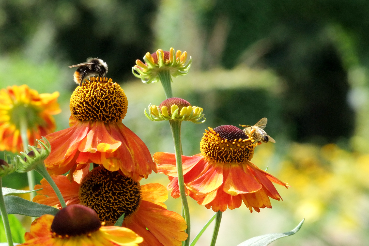 Ich befinde mich weiterhin auf meinem Pippi-Langstrumpfesken-Kreuzzug für die Auslöschung aller Schlechtwettererinnerungen an den Sommer 2012. Ich mach mir meine Welt eben, wie sie mir gefällt. Und Eure gleich mit. Erhöhter Schwierigkeitsgrad: Möglichst viele blütenbestäubende Puscheltiere in scharz-gelb mit aufs Foto bekommen. Das fördert einerseits den lokalen Fußballgroove, denn natürlich befinden sich Bienchen und Hümmelchen (immer wichtig zur Illustration von allem: Diminutiv) auf einer geheimen, nur den Dortmundern bekannten Mission zur Konvertierung aller Fans zum BVB-Tum (oder habt Ihr schon mal eine blau-weiße Hummel gesehen? Eben!) und andererseits sehen statische Blümchenbilder (da haben wir ihn wieder, den Diminutiv) mit aktivem Insekteneinsatz einfach dynamischer aus. Und dynamisch ist gut. Ebenso wie sonnig. Merke daher: Der Sommer 2012 war außerordentlich sonnig und dynamisch. So sollten alle Sommer sein!