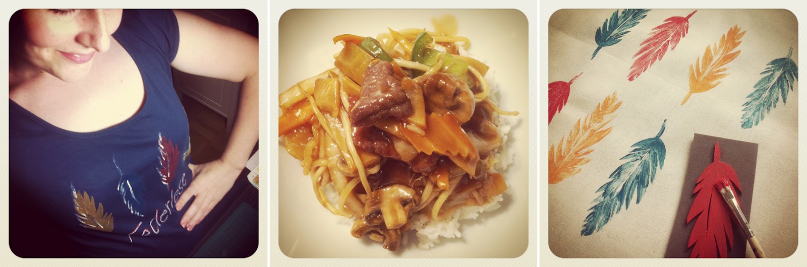 1. Neues selbstbedrucktes und bemaltes „Federlese“-Shirt. 2. Chop Suey. Wir nehmen uns immer wieder vor sonntags was zu kochen und landen doch immer wieder beim Lieferservice :)! 3. Mit den Federstempeln auch noch einen Baumwollbeutel bedruckt. Wie gehabt.