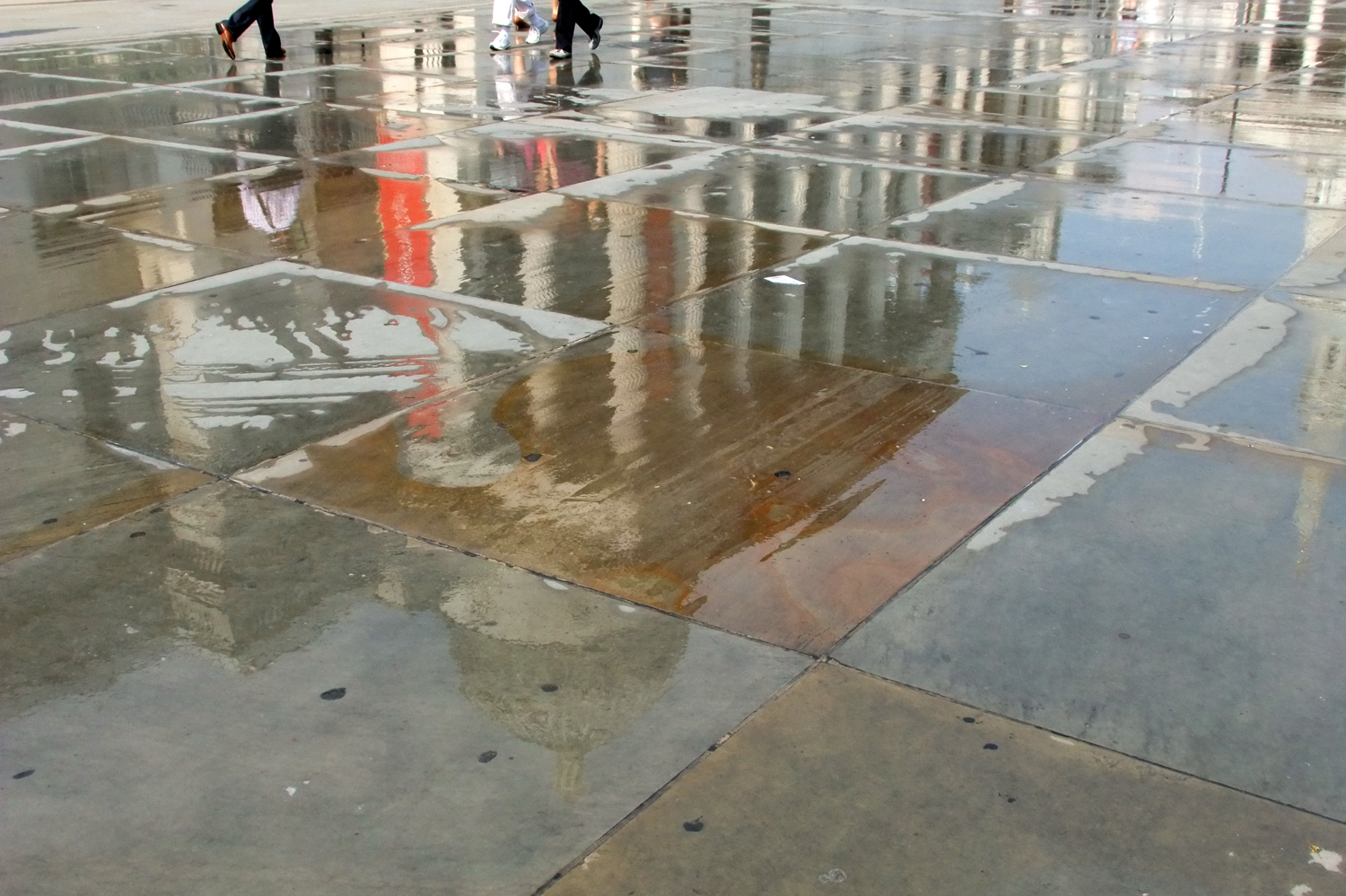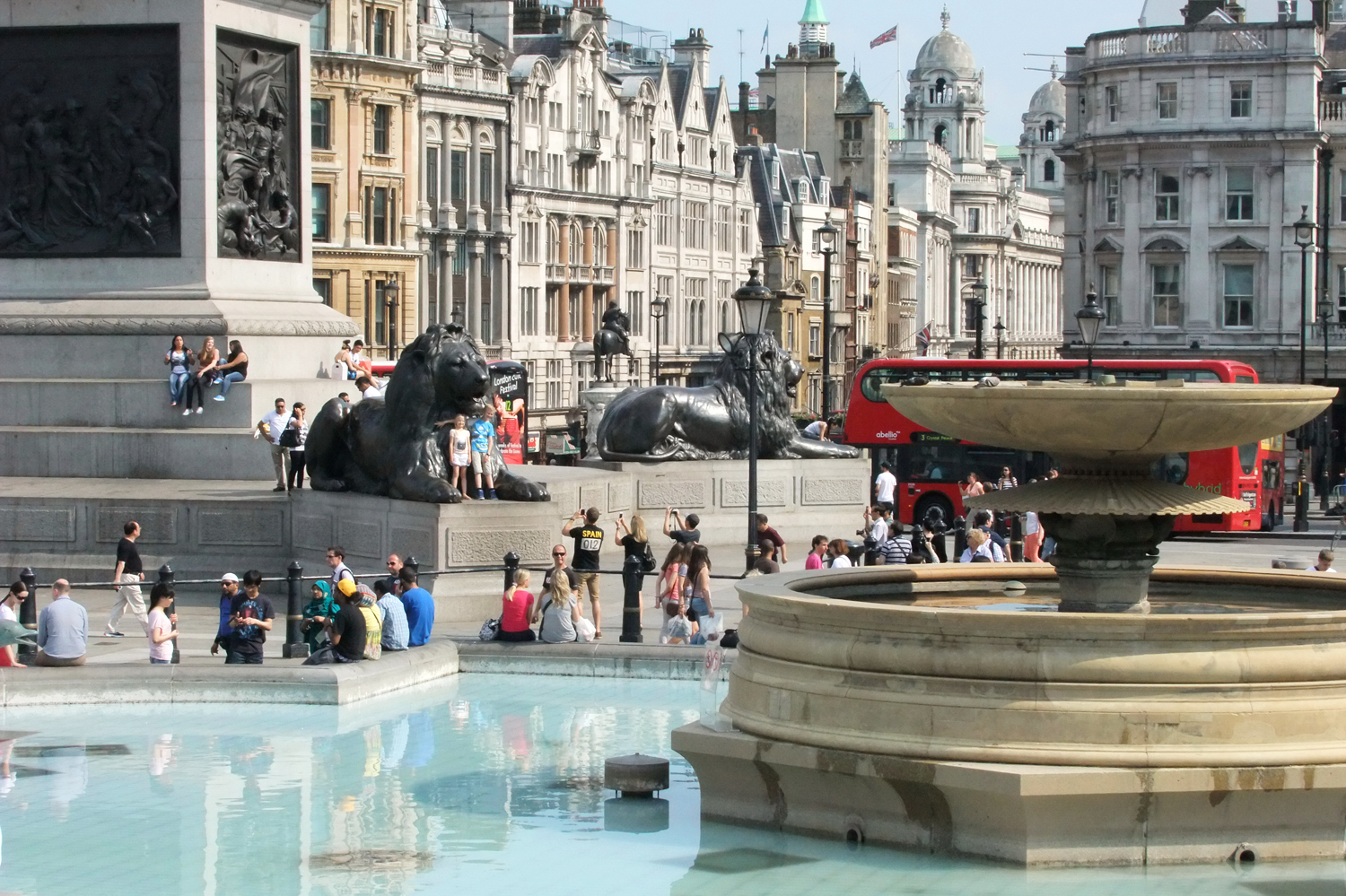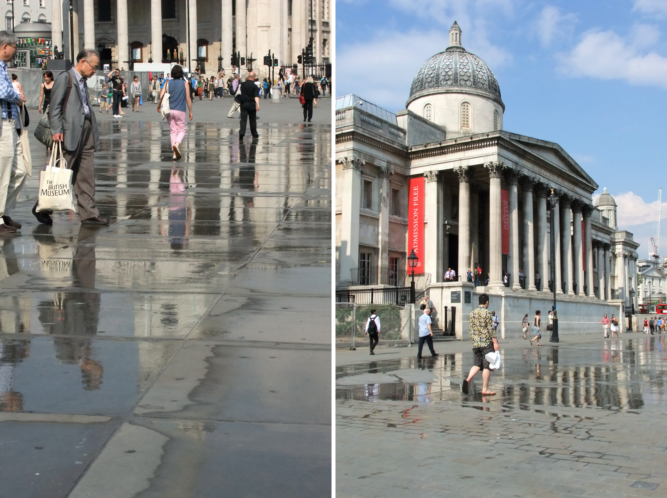 When we arrived at Trafalgar Square during our visit in London, the place had just been cleaned. The wet surface reflected buildings and people and the already busy place got even more busier.