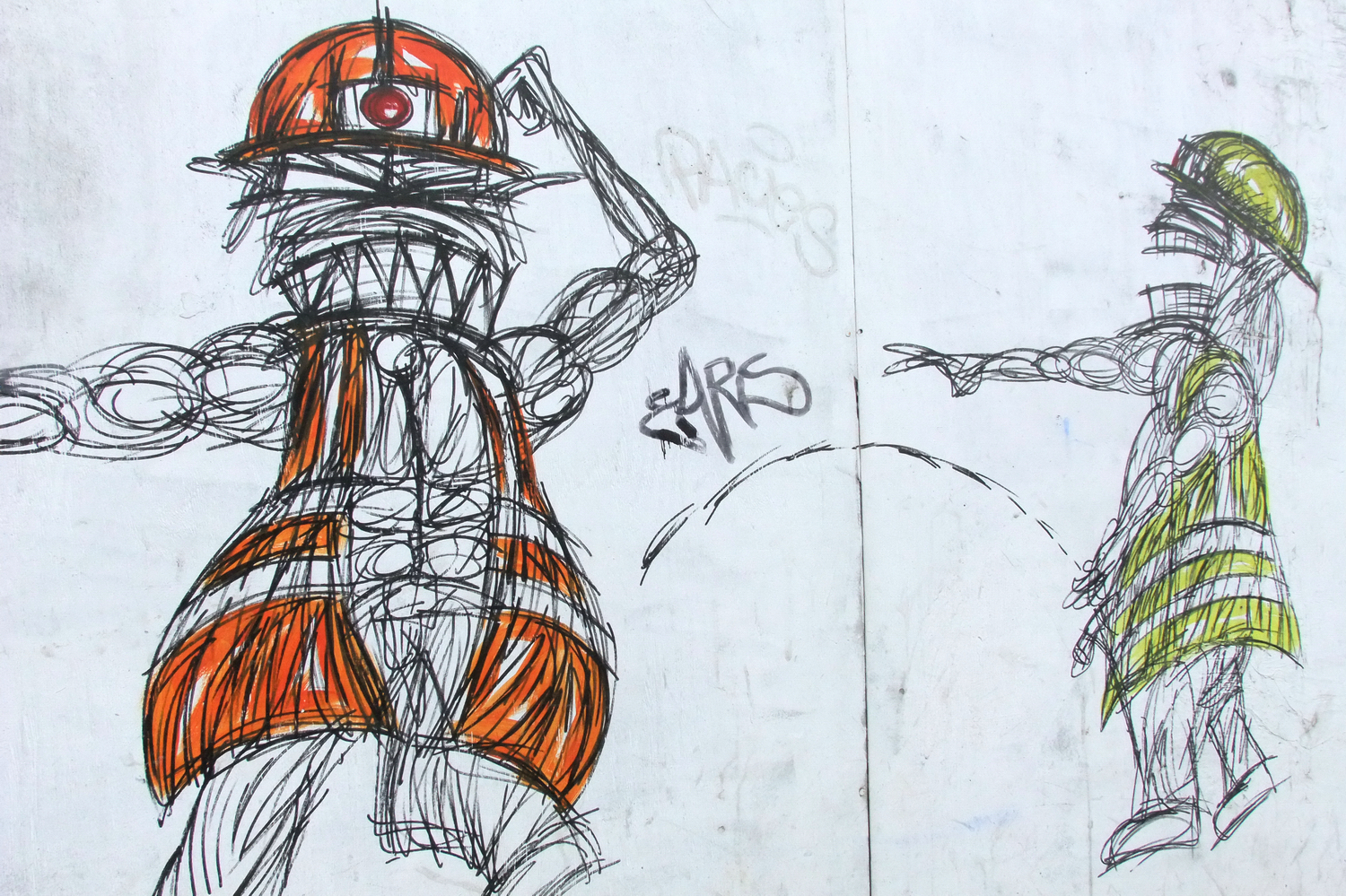 @Frau M. vom zehnten Stock links: Das sind lebengroße Bauarbeiterskizzen an einer Baustellenwand :)!