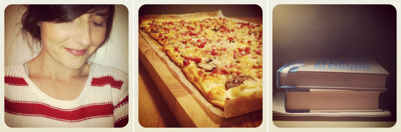 1. Streifen. 2. Flammkuchen, klassisch plus Pilze. 3. Bis spät in die Nacht Bücher gewälzt. //