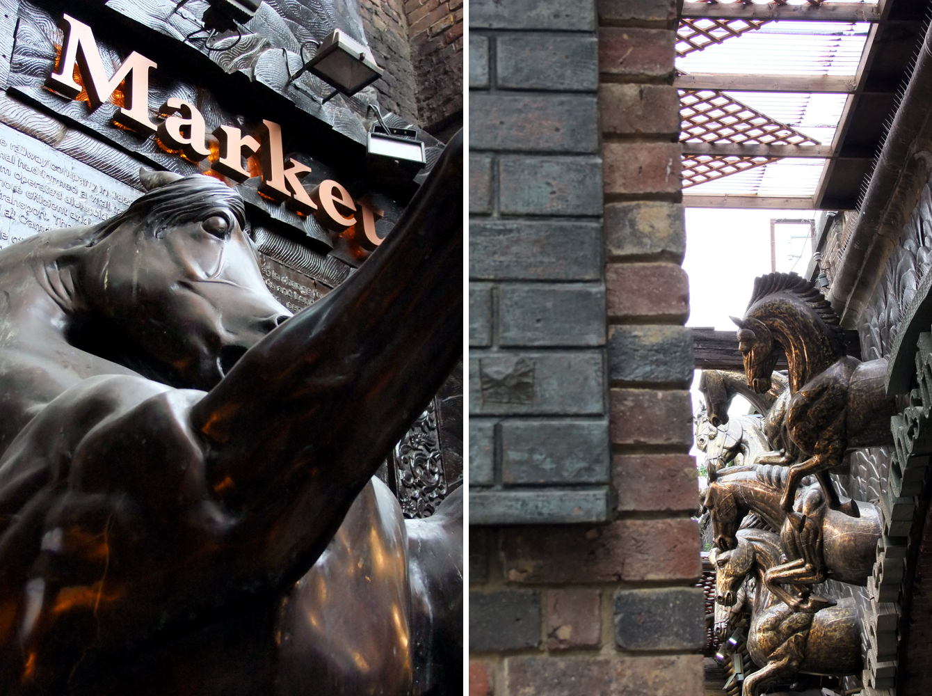 Camden Market besteht aus mehreren Märkten, die sich alle um die Camden High Street herum tummeln. Am liebsten bewege ich mich auf dem Stables Market, der so heißt, weil sich dort früher die Stallungen eines Pferdekrankenhauses (?) befunden haben. Pferdeplastiken hängen und stehen dort deswegen auch an allen Ecken und Enden. Das ist unbestritten sehr hübsch. Überhaupt: Als Fotomotiv gibt Camden mit all seinen Märkten und seiner bunten Hauptstraße durchaus etwas her. Aber damit erschöpft es sich für mich auch schon mehr oder weniger…