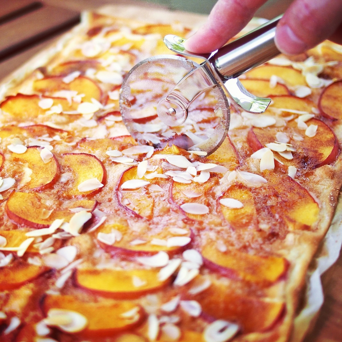 What a wonderful friday. Summer is finally here. I hope you enjoy it whenever you can. I made this peach tarte flambée for lunch two days ago and I thought you might enjoy it, too. All you need is some premade (or even homemade) dough, about 100g crème fraîche (or sour cream), two peaches, lots of sugar and cinnamon and some almond slices for topping (add them for the last five minutes of baking). Delicious. Cinnamon and almonds are not only for christmas, right? Have a great weekend.