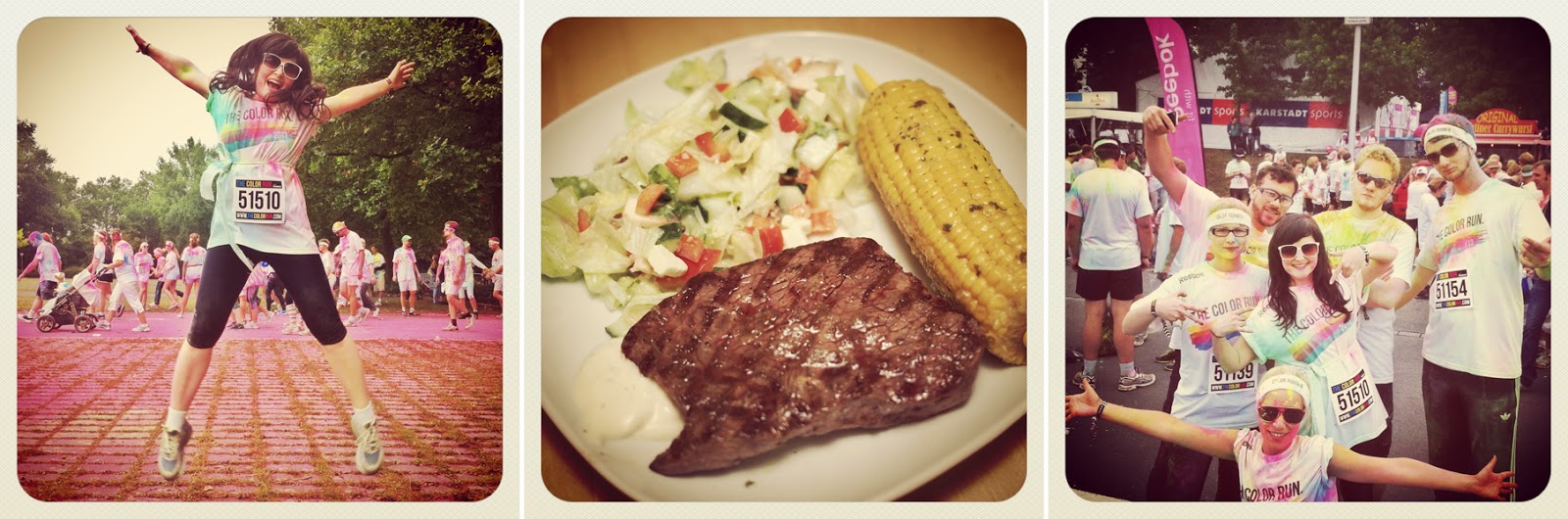 1. Laufsachen und viel bunte Farbe. 2. Schon wieder ein Steak. Diesmal liebevoll gebraten vom Freund als Belohnung nach dem absolvierten Color Run. 3. Mich mit dem Team aus den besten Nachbarn der Welt gemeinschaftlich in Farbe gewälzt und Spaß gehabt. Mehr Bilder hier.