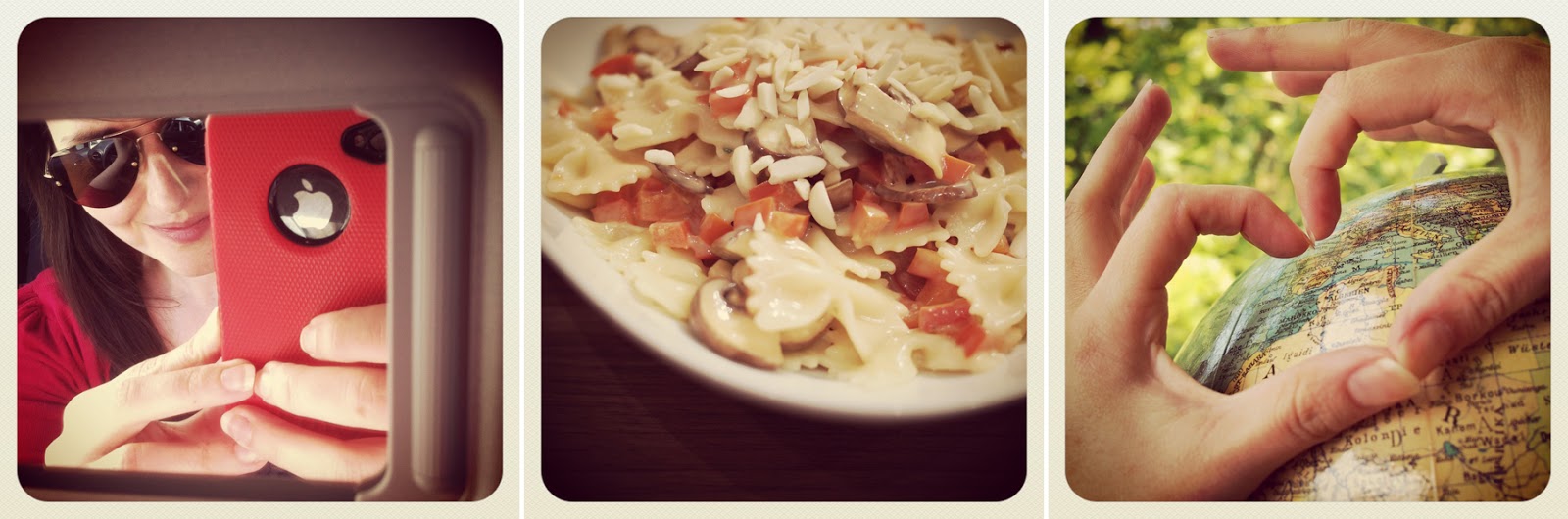 1. Meine Copbrille. Wichtig, damit man im Schminkspiegel gut aussieht. 2. Standard-Pasta à la Fee, mit Pilzen, Paprika, Wein-Sahne-Sauce und Mandelstiften. 3. Vom Urlaub geträumt, der (ich erwähnte es :)) nach der Abschlussarbeitsabgabe ansteht. Und an selbiger geschrieben. Natürlich.
