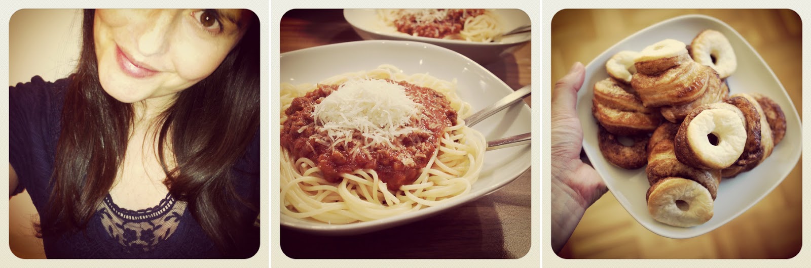 1. Blue dress with lace insert. 2. Spaghetti with bolognese sauce. 3. Failed at making cronuts.