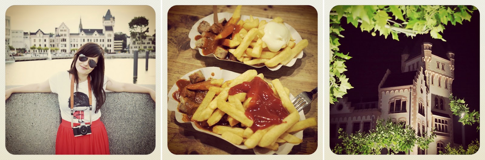 1. Red skirt, London shirt, cop glasses, no hands and a kind of weird facial expression. 2. Currywurst with fries. 3. Went on a wonderful evening walk at the Phoenix-See.