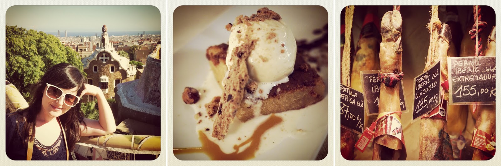 1. Blaues Kleid und Monstersonnenbrille im Park Güell. 2. Nach zwei deliziösen Hauptspeisen im Silenus einen ebenfalls deliziösen Blondie mit Ingwersauce als Nachtisch genossen. 3. Bevor wir uns im Park Güell mit Busladungen voller japanischer Touristen gestapelt haben, waren wir auch noch auf dem Mercat La Boqueria. Hier Schinkenkeulen inklusive Füße. Ist da so. Muss man durch.