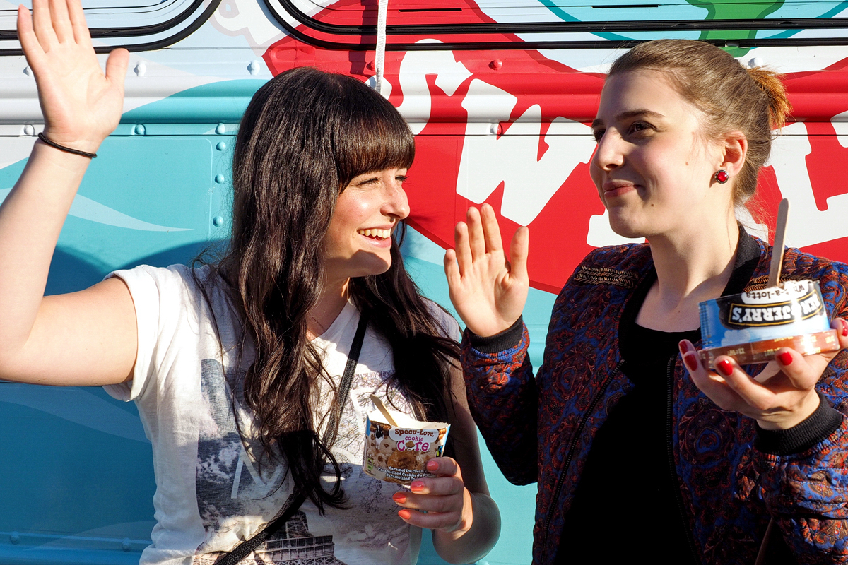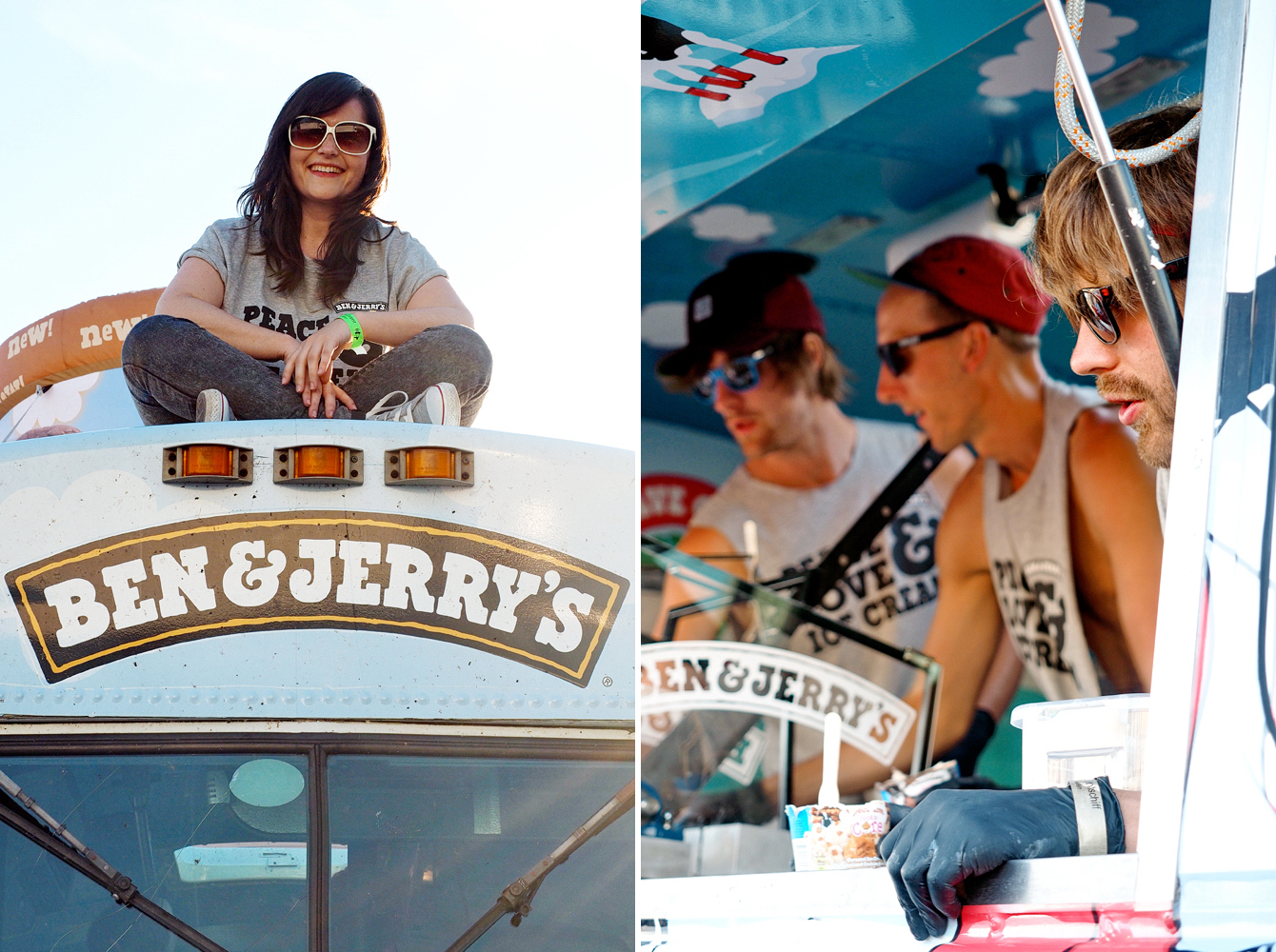 Die einen jubeln ihm zu, während er mit ausgebreiteten Armen eine Flut von Eis, die niemals enden wird, verspricht, während die anderen lautstark einfordern, dass die Flut gefälligst zeitnah beginnen möge. Was ihn wiederum dazu animiert, sein komödiantisches Talent noch ein bisschen weiter auszureizen. Ich für meinen Teil begebe mich zu diesem Zeitpunkt langsam in den Wagen, weil ich denke: Wäre ja cool, gleich die Massen der Eishungrigen durch das sich öffnende Fenster zu filmen und bei Periscope zu streamen. Tja, das denke ich aber auch nur, denn kaum bin ich drin, meint einer der Jungs zu mir. „Komm kletter hier auf die Kiste, dann kommst du rauf.“ Und ich: „Häh? Worauf?“. Und er: „Na, aufs Dach!“ Ich: Hysterisches Kichern. „Echt jetzt?“ Aber ich habe keine Wahl. Ungelenk wie nix steige ich auf die Kiste, von dort auf seine Schulter und zerre mich mit der Eleganz eines Nilpferdes auf das Dach des Bullis. Wo ich mich im nächsten Moment den erwartungsvollen Gesichtern tausender „Ben & Jerry’s“-Jünger gegenüber sehe, die vermutlich alle gerade DAS live ins Internet gestreamt haben. Naja, sei es drum. Jetzt bin ich oben und die Aussicht ist gut.