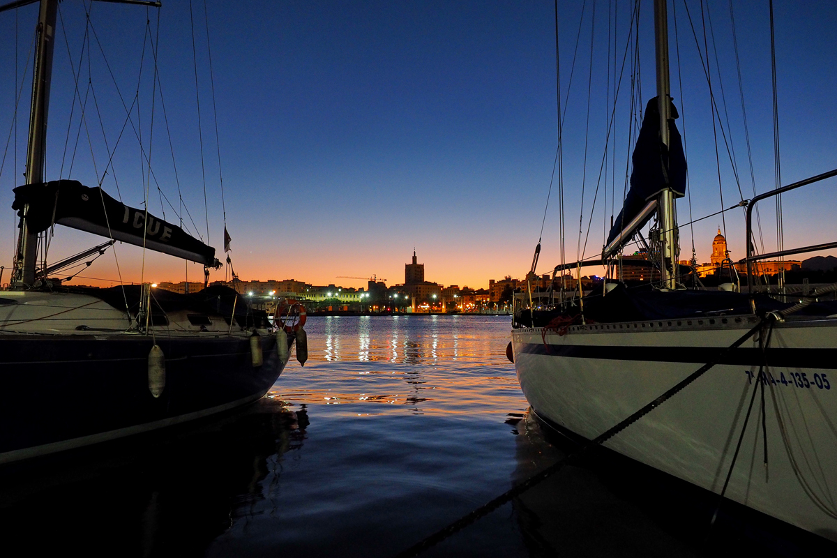 Alternativ lässt man die Fischrestaurants links rechts liegen und läuft (oder fährt) zurück in die Innenstadt und schaut am Hafen vorbei. Die blaue Stunde zaubert einen Farbverlauf an den Himmel, der jeden Babyshower-Planer in Ekstase versetzen würde, und durch die Laternen an der Promenade tanzen kleine Lichter auf den Wellen auf und ab und legen einen magischen Schleier über die eigentlich recht nüchterne Szenerie. Die vielen Cafés und Restaurants entlang des palmengesäumten Hafenkais erwachen zum Leben und überengagierte Mitarbeiter versuchen die flanierenden Besucher von der Einzigartigkeit des jeweiligen Etablissements zu überzeugen. Eigentlich ist uns klar, dass man hier zwar schöne Fotos machen, aber anderswo (nämlich zum Beispiel da, wo wir gerade herkommen ;)) vermutlich besser essen kann, aber die müden Füße und Köpfe lassen uns wider besseres Wissen einkehren. Nun ja. Wir entscheiden uns später wenig überraschend dafür, am nächsten Tag in weniger touristischer Atmosphäre im „El Meson de Cervantes“ zu speisen, ein voller Erfolg, wie auch schon im Video erwähnt. Details dazu dann demnächst. Aber immerhin rauscht das Wasser hier am Hafen schön entspannend, das ist ja auch nicht zu verachten ;)!