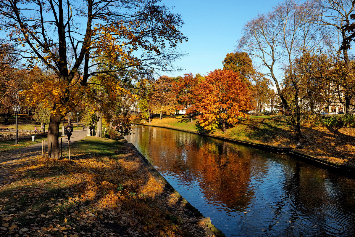 Abgesehen von der Tatsache, dass sich die Temperaturen in Riga während unseres Aufenthalts immer schön um den Gefrierpunkt bewegten (kälter wurde es in Dortmund den ganzen „Winter“ noch nicht) und ich neben meiner dicken Puscheljacke vor allem eine dauerhaft rote Nase als Accessoire mit mir herumtrug, wurden wir mit dem wundervollsten Herbstwetter belohnt, das man sich nur vorstellen kann. Die Sonne strahlte vom türkisblauen Himmel, als gäbe es kein Morgen – zumindest so lange „der Tag“ andauerte. Was in Riga Ende Oktober zugegebenermaßen nicht besonders lang ist. Gegen 16 Uhr ist das Licht auf einmal weg. Bumms. Dunkel. Aber wer früh aufsteht, hat trotzdem eine Menge vom Tag und am Nachmittag geht man dann einfach shoppen ;)! Und der niedrige Sonnenstand zu dieser Jahreszeit hat auch durchaus Vorteile: In Prinzip ist den ganzen Tag goldene Stunde. Die Lichtstimmung und die Farben sind zum Niederknien. Ein Paradies für Fotografen.